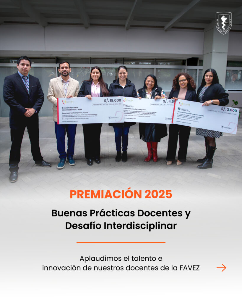 La Facultad de Medicina Veterinaria y Zootecnia (FAVEZ) de la Universidad Cayetano celebra con orgullo a nuestros docentes y estudiantes reconocidos en la premiación de Buenas Prácticas Docentes y Desafío Interdisciplinar 2025, por proyectos que marcan un impacto positivo en la sociedad, humana y el ambiente.